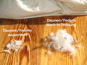 Die Daunen & Federn werden durch verschiedene Techniken von der Hülle (Stoff) getrennt. Bei in Karos abgesteppten Hüllen geht dies nur, indem wir die Hülle zerschneiden – es wird also eine neue Hülle nötig. Bei teilweise abgesteppten Decken kann sogar häufig die Hülle gewaschen und wieder verwendet werden.
